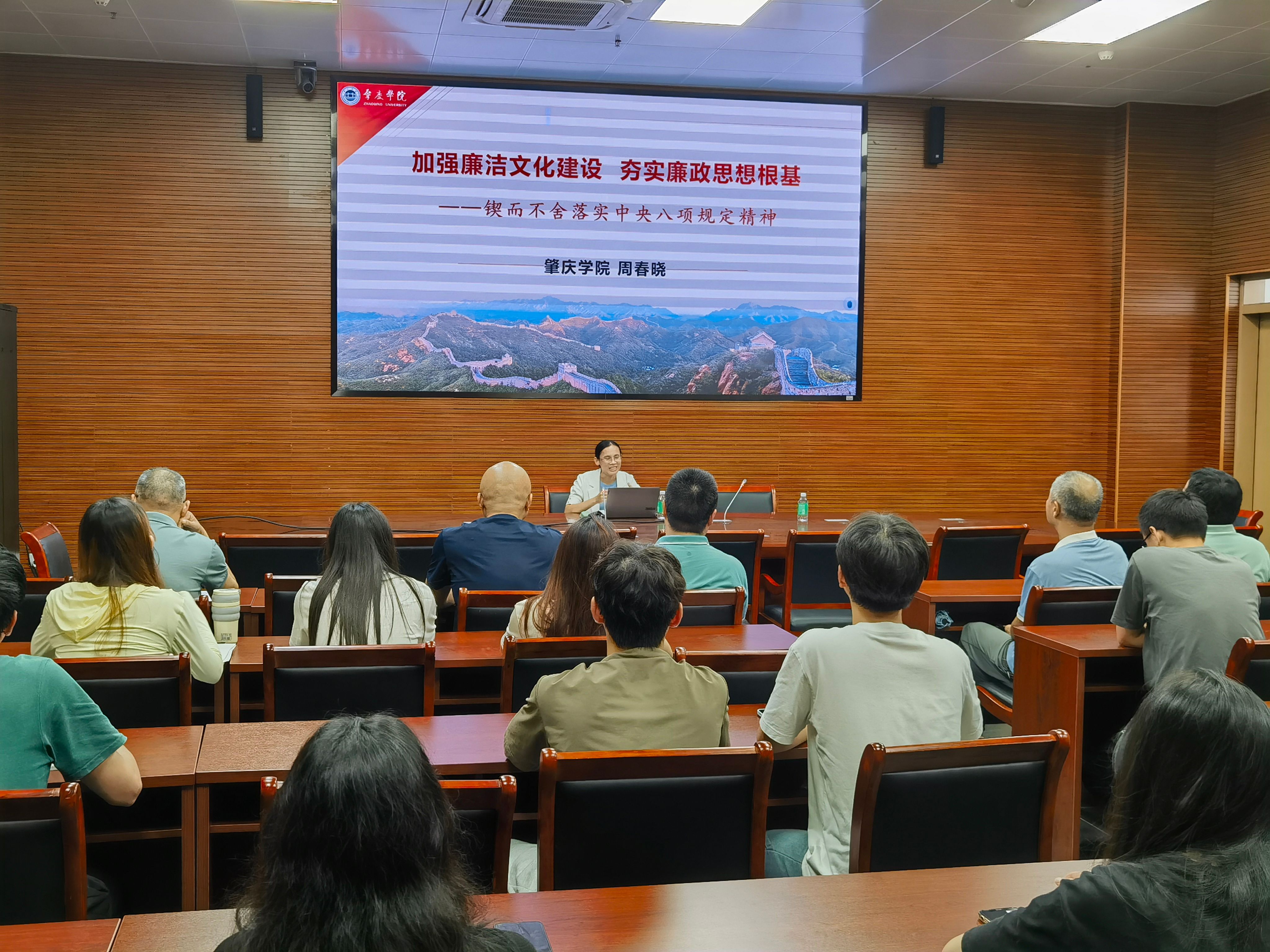 为进一步深入学习领会习近平总书记关于加强党的作风建设的重要论述,学习领会和贯彻落实中央八项规定及其实施细则精神,推进作风建设常态化长效化。6月18日下午,环境与化学工程公司党委邀请马克思主义公司副教授、学科教学(思政)专业硕士生导师,肇庆市高层次人才周春晓博士开展“加强廉洁文化建设 夯实廉政思想根基”专题宣讲会,公司师生党员代表50余人参会。