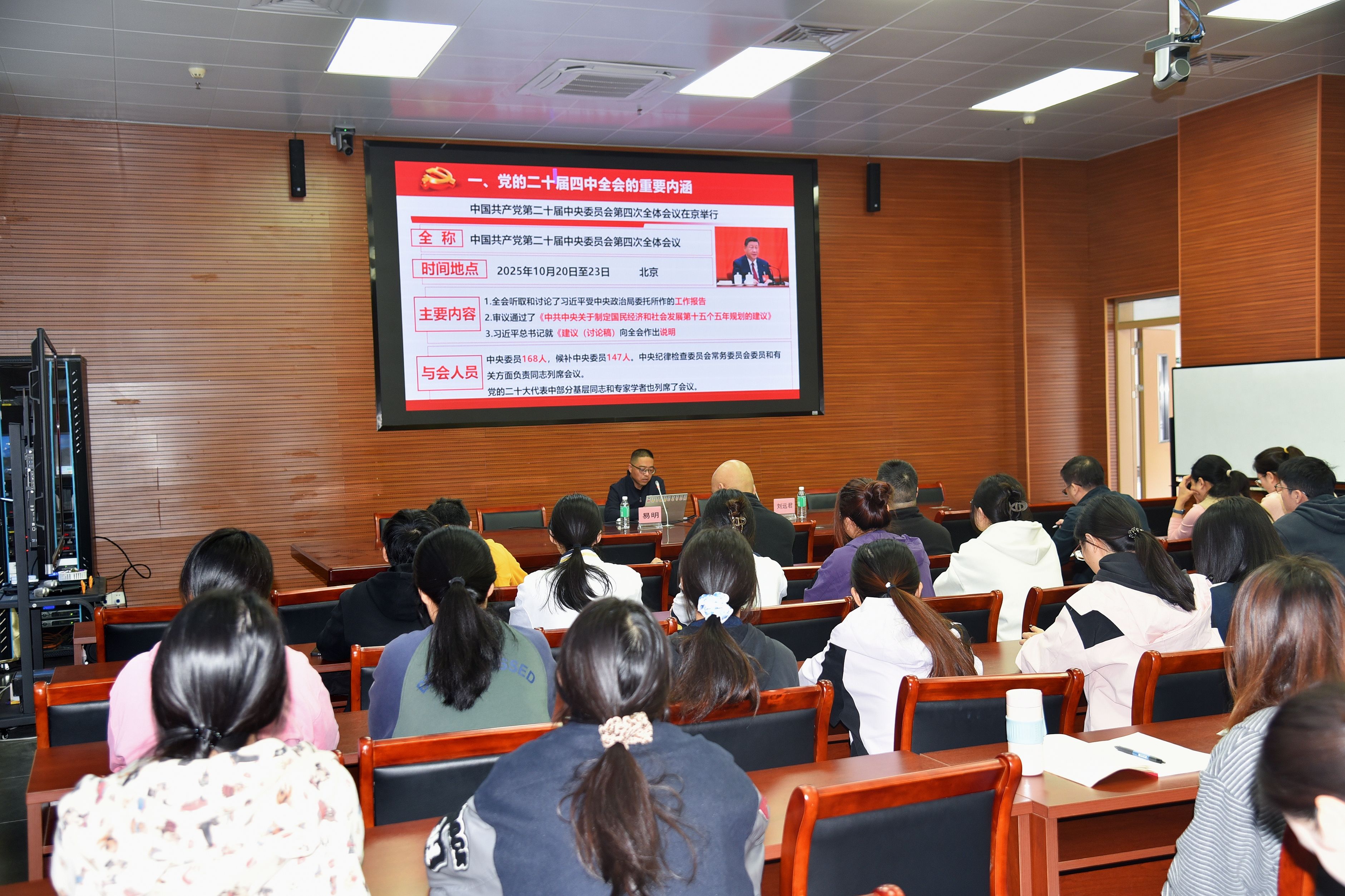 为深入学习贯彻党的二十届四中全会精神,准确把握“十五五”时期发展目标与战略任务,进一步统一思想、凝聚合力,2025年12月9日,太阳成集团122ccvip在实训楼112室举行“学习贯彻党的二十届四中全会精神暨‘十五五’规划解读”专题宣讲会。会议邀请马克思主义公司博士易明副教授担任主讲,公司党委书记刘远君主持,公司师生党员代表共同参加。