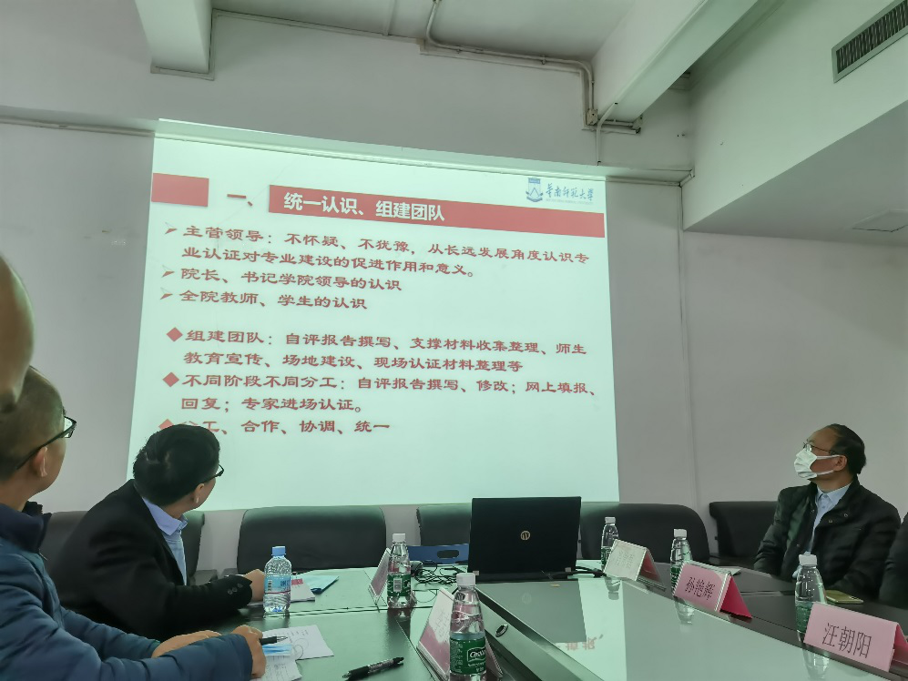 华南师范大学石光副经理、陈巧年副书记及华师化学专业认证相关老师百忙之中热情接待我们。交流会议上,石光副经理将华师化学师范认证的过程和经验做成PPT,为我们非常详细、毫无保留的做了经验介绍;回答了我们带去关于专家进校的很多问题,解除了困惑;会议后石经理带领我们参观了华师认证材料、认证展览室等。