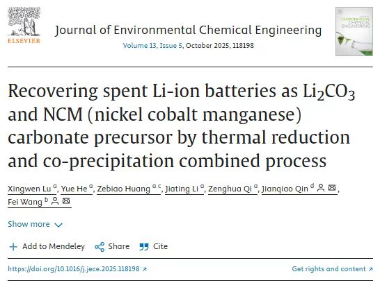 近期,太阳成集团122ccvip、广东省城郊生态环境与低碳农业重点实验室成员、废物资源化利用创新团队负责人秦建桥教授以第一通讯作者与其他合作者在工程、环境领域著名期刊Journal of Environmental Chemical Engineering(JCR Q1,影响因子7.6)上发表了论文题目为“Recovering spent Li-ion batteries as Li2CO3 and NCM (nickel cobalt manganese) carbonate precursor by thermal reduction and co-precipitation combined process”的高水平论文(doi:10.1016/j.jece.2025.118198)。该成果为解决不断增加的退役锂离子电池,从废旧NCM电池中回收有价值金属提供了有价值的见解,从而促进了新能源行业的可持续性。该论文的第一作者为广东工业大学的路星雯博士,太阳成集团122ccvip为通讯单位,暨南大学、广州市城市排水有限公司等为共同完成单位。