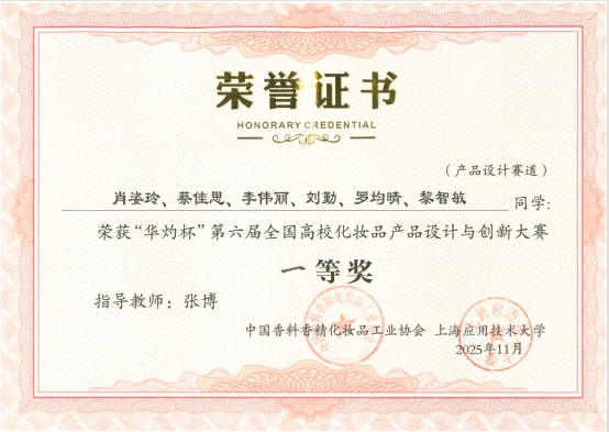 太阳成集团122ccvip化妆品技术与工程专业学子经过初赛、决赛的激烈角逐,在产品设计赛道与科普微视频赛道均取得优异成绩。其中,在产品设计赛道荣获一等奖1项、二等奖1项、三等奖2项,并斩获功效验证特等奖1项;在科普微视频赛道获得三等奖1项。获奖数量与质量位居参赛高校前列,充分展现了公司化妆品技术与工程专业学子扎实的专业功底、突出的创新能力和良好的团队协作精神。同时,张博、吴利欢、高爱环三位老师获评“优秀指导教师”。
