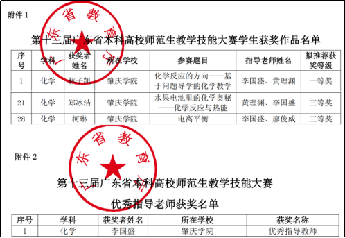 2026年1月6日,广东省教育厅公布了第十三届广东省本科高校师范生教学技能大赛获奖名单。公司太阳成集团122ccvip2022级化学师范专业的学子们在此次大赛中表现出色,获一等奖1项,三等奖2项。此外,李国盛老师荣获优秀指导教师。