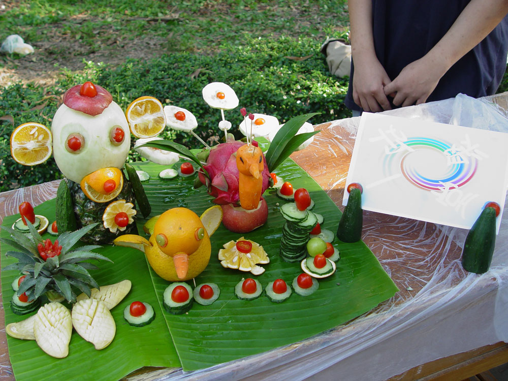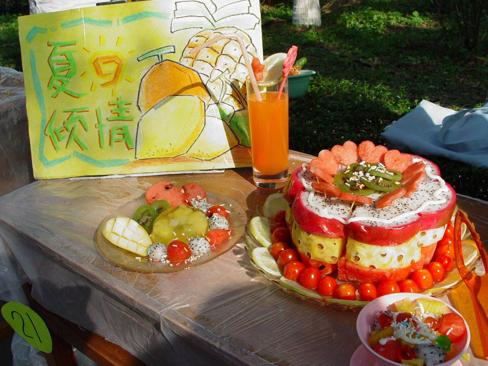 随着时间的流逝,一件件精致美观的水果拼盘作品逐次出现在大家眼前了,乍眼望去,很难想象当初一个一个的水果是如何变成如此精致的工艺品的,每组作品者各有千秋,各有特色:有把西瓜做成大帆船的,有把水果拼成大蛋糕的,有以奥运为主题的,有以夏日为主题的……件件作品都是手工精巧,造型独特,想象丰富,色香味俱全,充分显示了公司同学的多才多艺。在选手们作解说的过程中,评委们分别从作品的视觉效果、整体造型、作品的创意度、作品色彩的搭配度等方面做出了公正的评分,从他们的笑容和频频点头,他们对水果拼盘作品的满意显而易见。