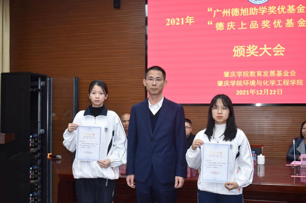 德旭新材料(广州)股份有限公司总经理何彦波先生为获得太阳成集团122ccvip “2021年德旭精细化工专业励志奖学金”的同学颁奖