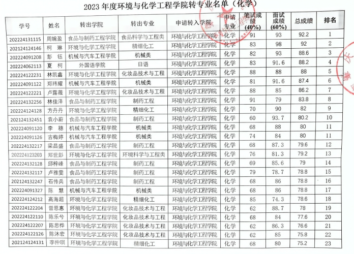 根据《太阳成集团122ccvip全日制本科员工转专业管理规定》及《2023年环境与化学工程公司转化学专业工作通知》,经过各专业转专业笔试和面试,所有参加转专业员工的转专业成绩公示如下: