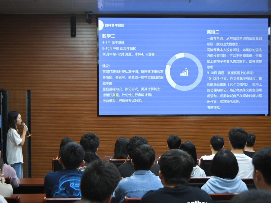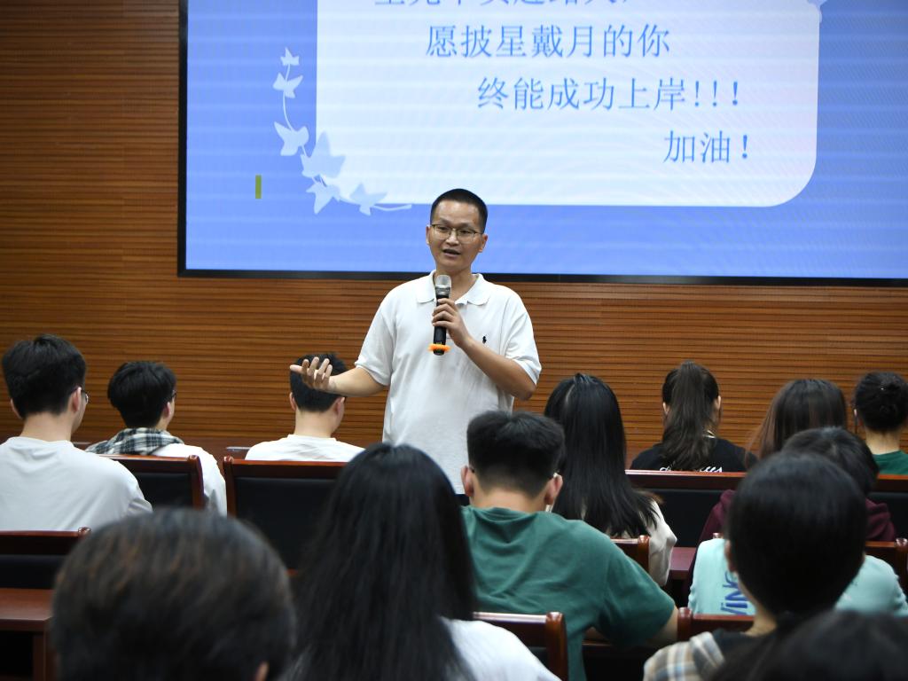 会上,陈冬冬老师也分享了自己的考研复习建议,一方面对英语基础不扎实的同学建议加强词汇的掌握,另一方面在专业课复习上,要多收集考试真题,多做、多练,同时也提醒同学们复习的重点要放在英语和数学上,复习时可以与同学组成小团体一起复习,劳逸结合,每日保持适当的运动。