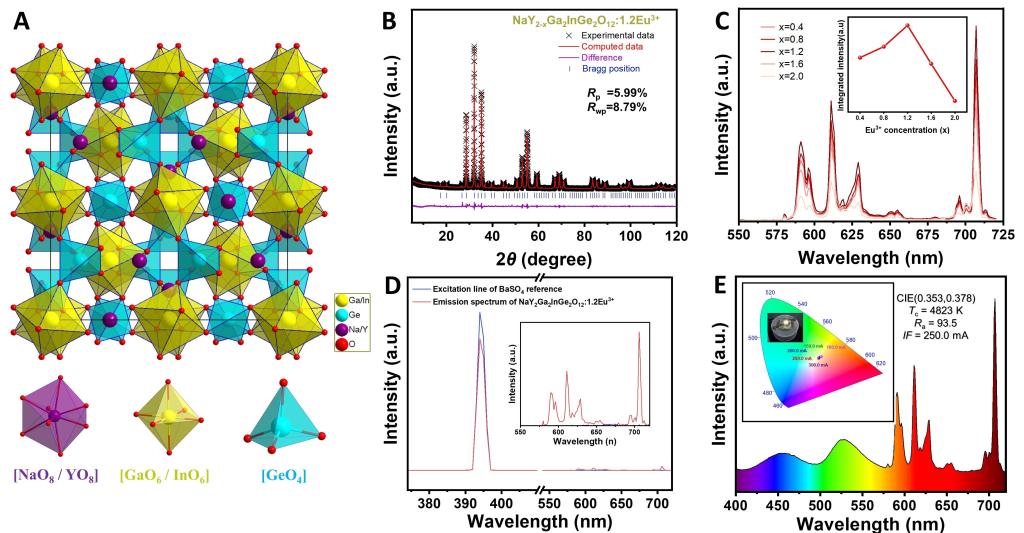 附图1 NaY2-xGa2InGe2O12:xEu3+荧光粉的晶体结构、光谱特性及WLED器件应用展示图