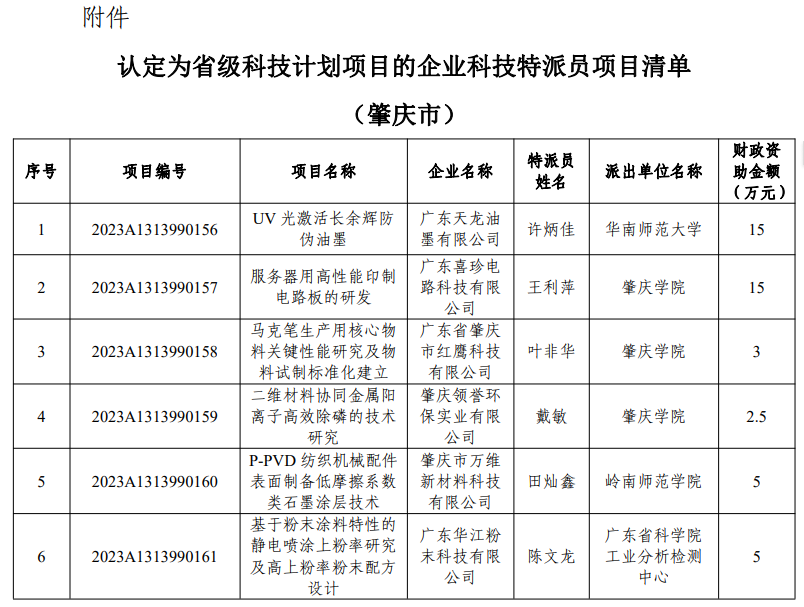 据广东省科学技术厅(粤科函资字[2024]189号)文通知,由公司叶非华和戴敏两位老师担任科技特派员的科技特派员项目被认定为省级科技计划项目,并受到财政资金资助。