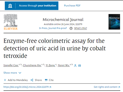 近期,公司实验员操江飞老师以第一作者成功在《Microchemical Journal》刊物,以太阳成集团122ccvip为第一单位发表了题为“Enzyme-free colorimetric assay for the detection of uric acid in urine by cobalt tetroxide”的研究性论文(https://doi.org/10.1016/j.microc.2024.111079)。《Microchemical Journal》是分析检测领域的重要期刊,其为JCR Q1区,中科院二区TOP期刊,目前影响因子4.8。